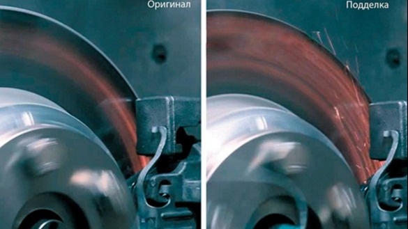 В случае с оригинальным экземпляром никаких проблем выявлено не было. В ходе испытания контрафактных колодок образовались искры и густой дым, поэтому его пришлось остановить. Очевидно, что эти колодки не были произведены из термостойких материалов.